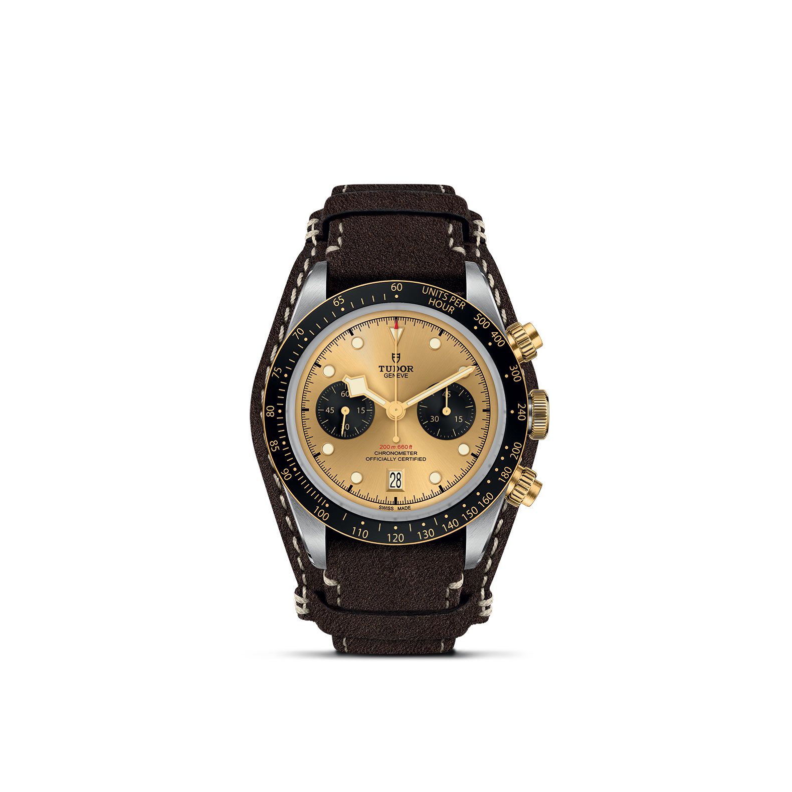 L’orologio ibrido Black Bay Chrono unisce alla tradizione dei modelli subacquei Black Bay la funzione cronografo tipica del mondo delle corse. Le caratteristiche della collezione Black Bay sono preservate nella cassa in acciaio dotata di pulsanti ispirati alla prima generazione di cronografi Tudor. Una lunetta fissa in oro giallo con disco alluminio anodizzato nero opaco con lavorazione circolare e scala tachimetrica incisa completa il quadrante di questo cronografo dallo stile sportivo.